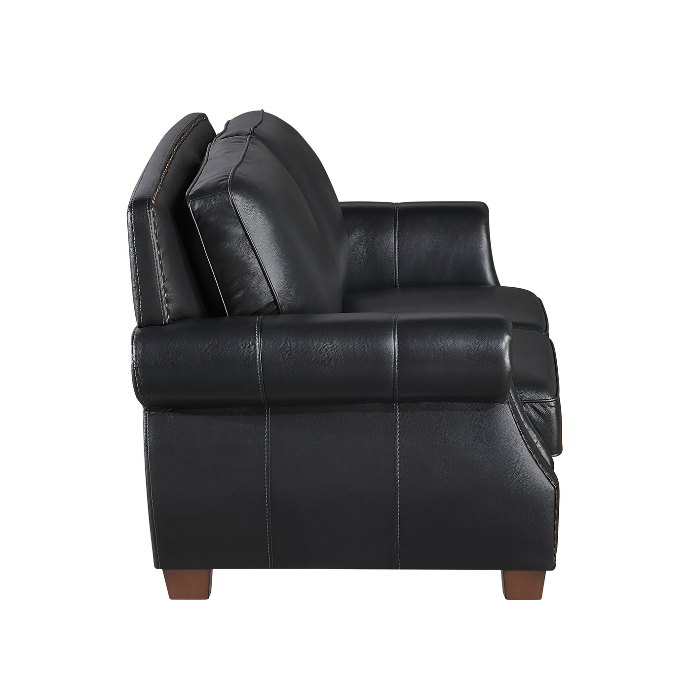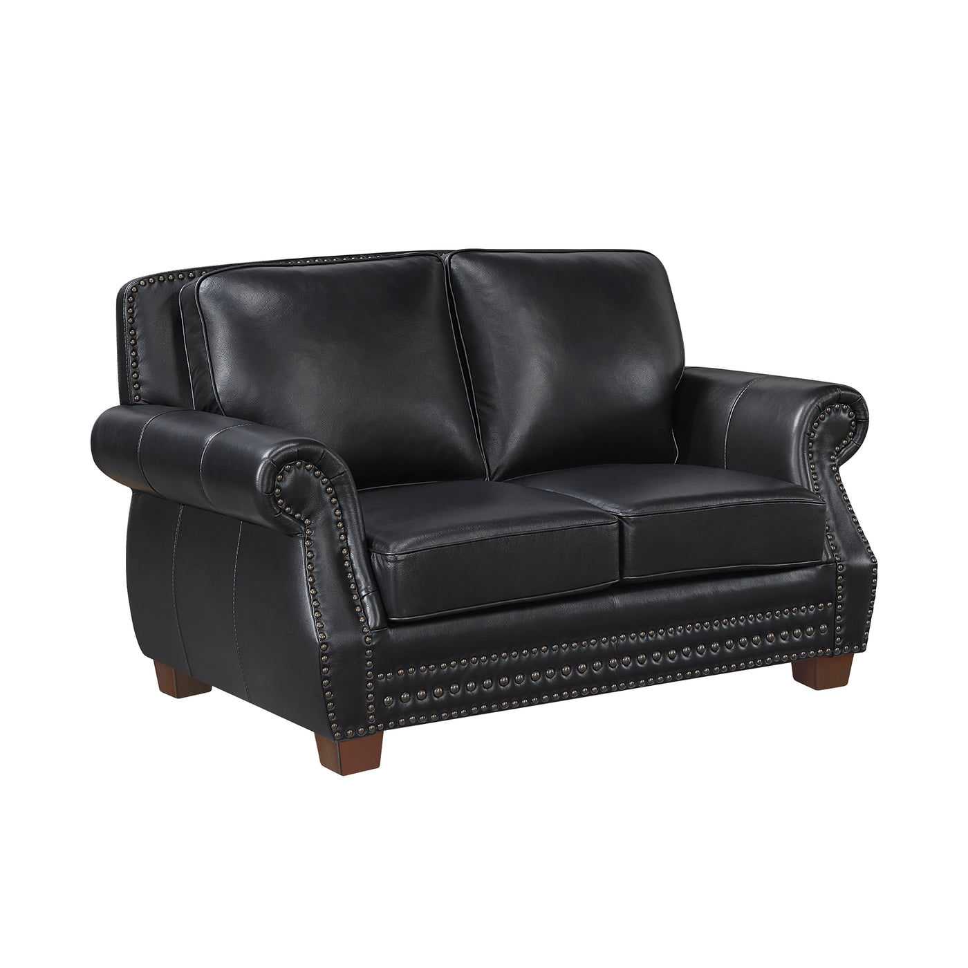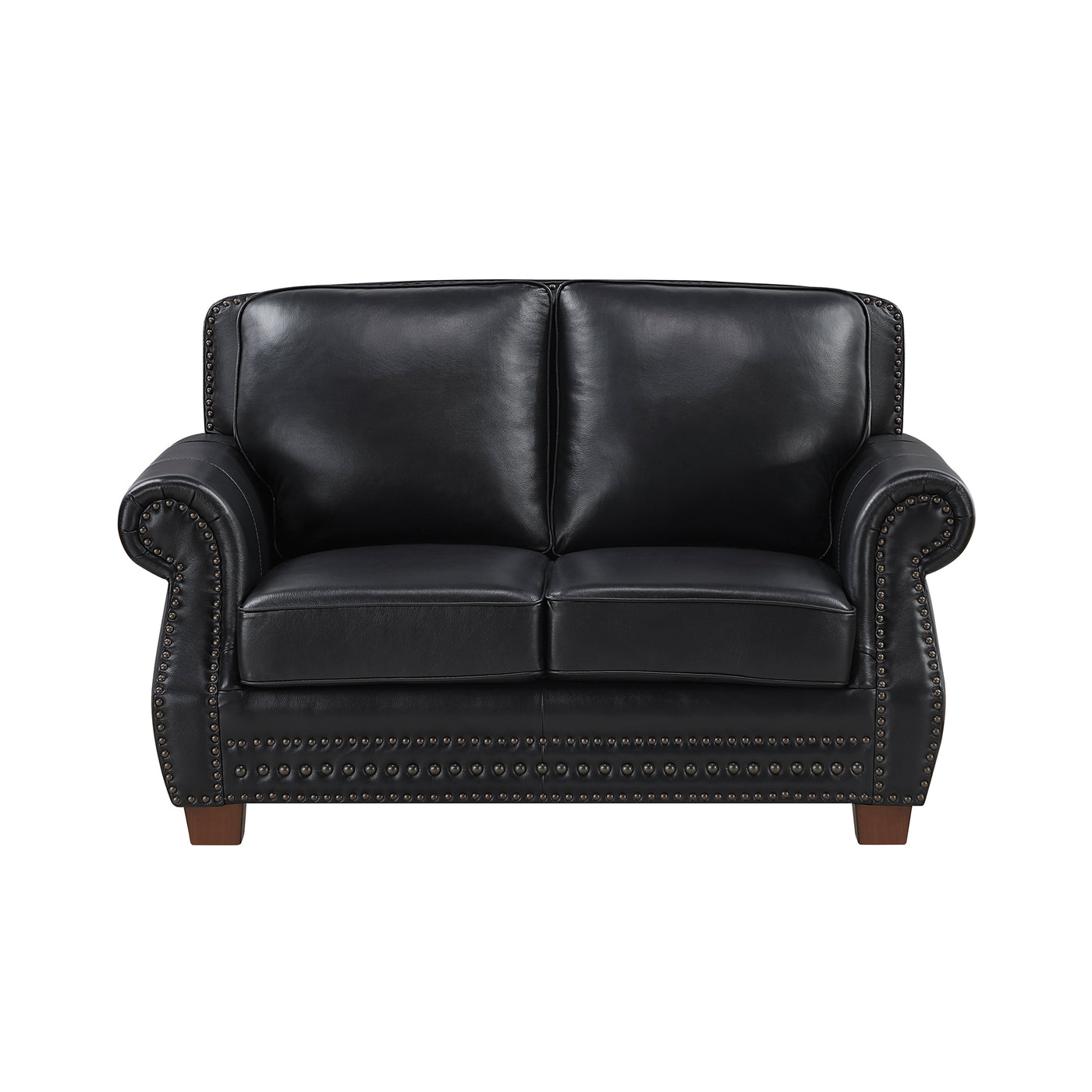 Timeless elegance meets exceptional comfort in this sophisticated leather loveseat. Upholstered with luxurious 100% top-grain leather on the seating surfaces, this piece offers a rich, supple feel that invites relaxation. Durable faux leather on the sides and back ensures lasting beauty and resilience. The classic design is enhanced by refined rolled arms and eye-catching nailhead trim, adding a touch of traditional style to any living space. Featuring supportive pocket coils encased in plush foam padding, this loveseat provides superior comfort for hours of lounging. Built with a sturdy plywood frame and solid wood feet, this durable loveseat is a perfect addition to smaller spaces without compromising on style or quality. The collection offered in brown and black color.
